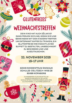 Herzliche Einladung zu einem Kaffeetrinken mit Kindern, Zeit für Austausch und dem Gestalten eines glutenfreien, weihnachtlichen Buffetts im Gemeindezentrum, Schulze-Delitzsch-Weg 28.
