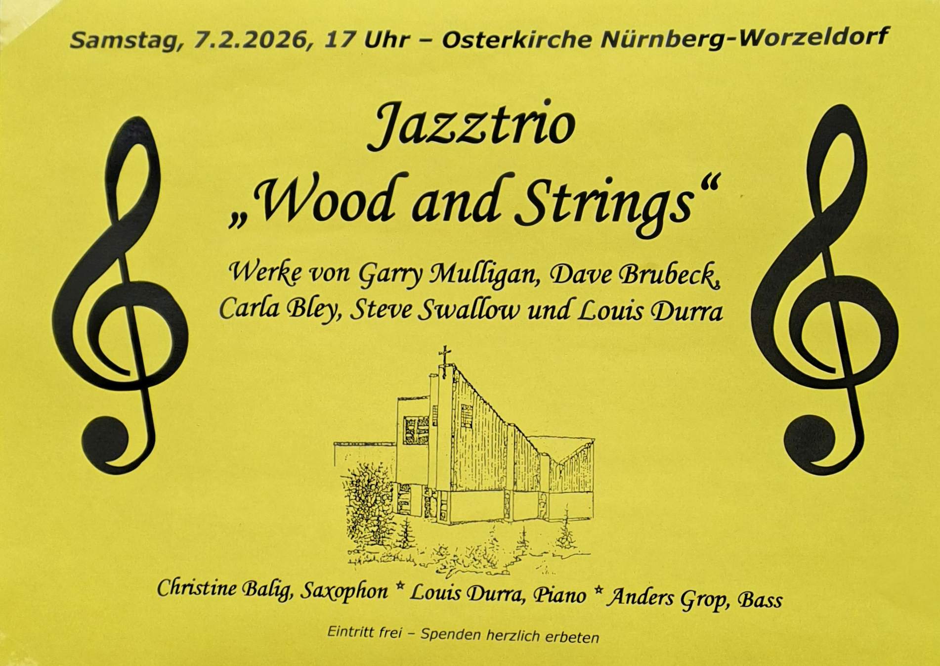 ich freue mich sehr, Sie/Euch zum Konzert des hochklassigen Jazztrios "Wood & Strings" am Samstag, 7.2., um 17 Uhr in der Osterkirche Worzeldorf, An der Radrunde 109, 90455 Nürnberg einladen zu dürfen.